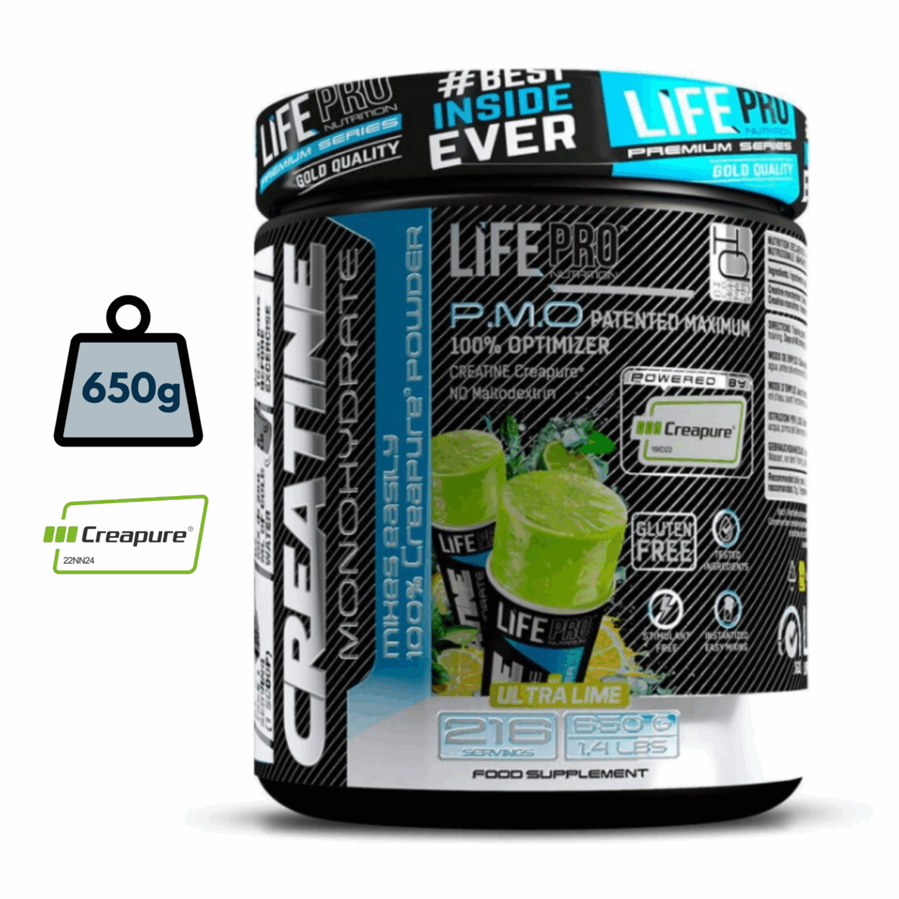 La Creatina Creapure LifePro 650g Sabores está formulada con 100% creatina monohidrato de máxima pureza, avalada por el sello Creapure®, que certifica su calidad, seguridad y trazabilidad bajo los más estrictos controles de fabricación.
