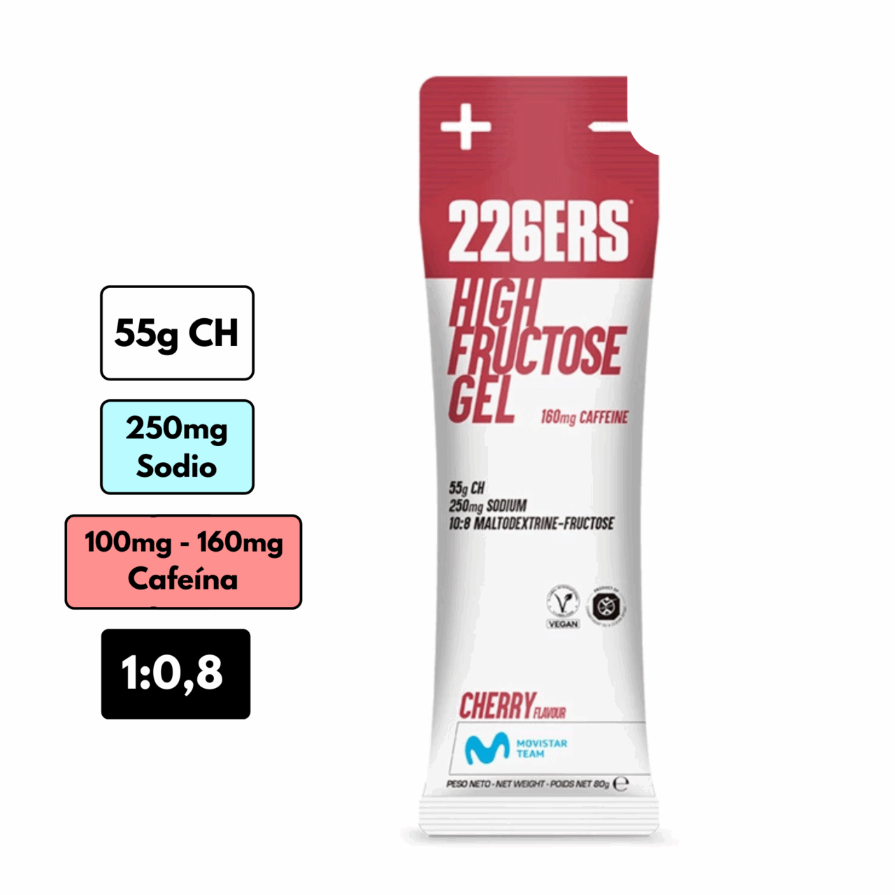 El High Fructose Gel de 226ers Con Cafeína presenta 55g de carbohidratos a partir de maltodextrina y fructosa en ratio 1:0,8, 250 mg de Sodio 100 mg de Cafeína.