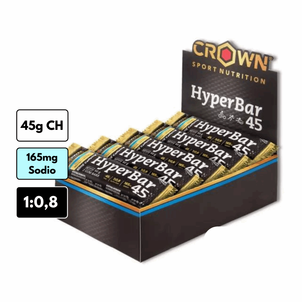 La Hyper Bar 45 de Crown es una barrita con textura entre gelatina y gominola elaborada con un ratio glucosa-fructosa de 1:0.8, aportando 45 gramos de hidratos de carbono y 165mg de sodio.