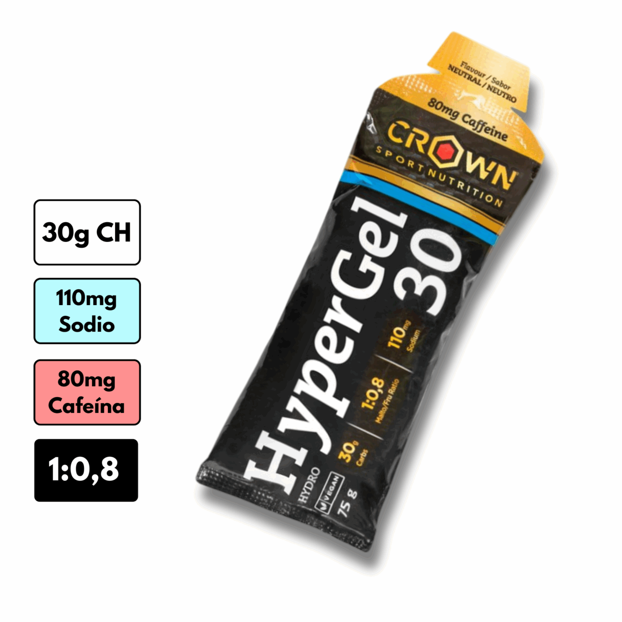 El Hypergel 30 de Crown Con Cafeína tiene 30g de carbohidratos en proporción 1:0,8 a través de maltodextrina y fructosa. Contando además con 110mg de sodio y 80mg de cafeína.