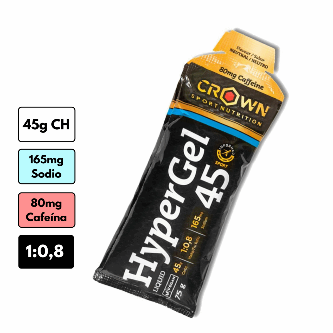 El Hypergel 45 de Crown Con Cafeína tiene 45g de carbohidratos en proporción 1:0,8 a través de maltodextrina y fructosa. Contando además con 165mg de sodio y 80mg de cafeína.