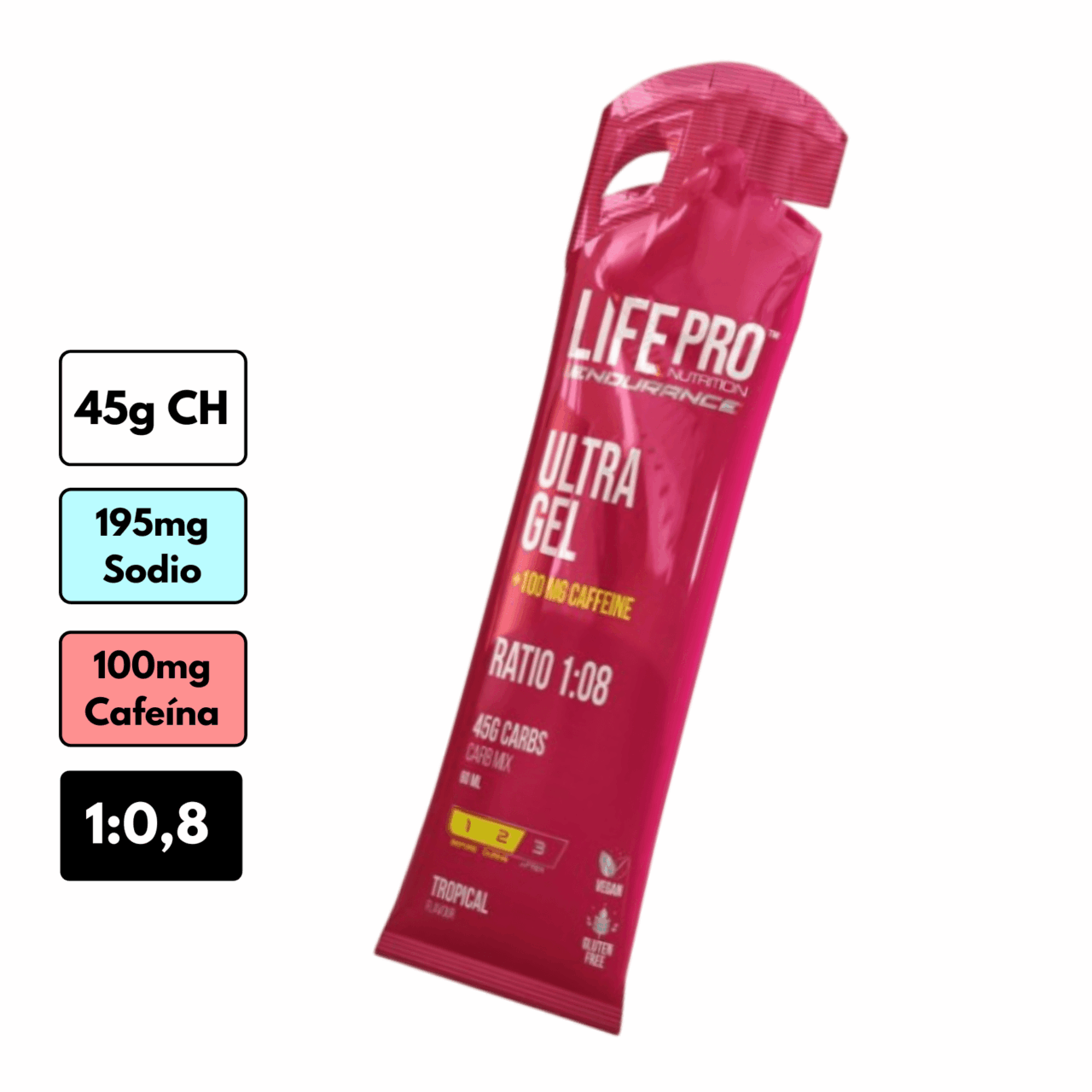 El Ultra Gel LifePro Con Cafeina tiene 45g de carbohidratos en proporción 1:0,8 a través de maltodextrina y fructosa. Contando además con 195mg de sodio y 100mg de cafeína.