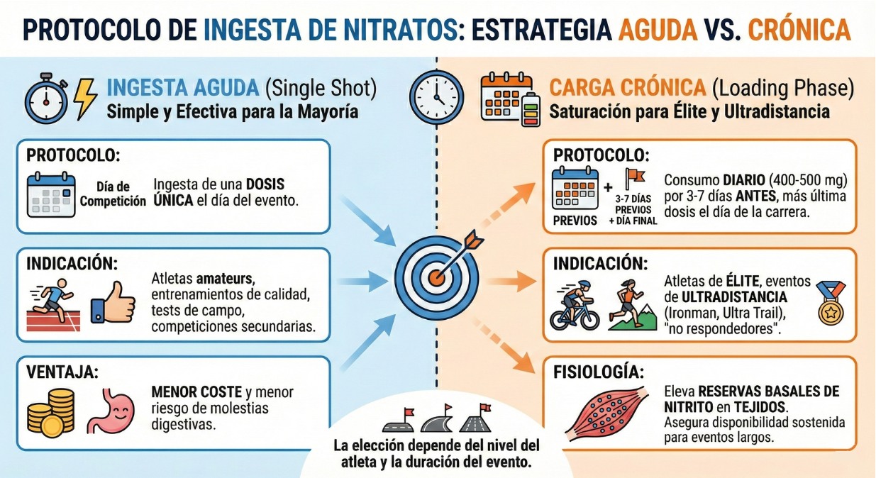 Explicación: La carga aguda (un solo shot 2.5h antes) es suficiente para elevar el nitrito en sangre en la mayoría de deportistas. Sin embargo, la carga crónica (tomar un shot diario durante la semana previa) satura también los depósitos en los tejidos musculares, siendo la estrategia preferida para atletas profesionales y pruebas de ultradistancia (Ironman, Ultra Trail) para mantener el efecto más tiempo.