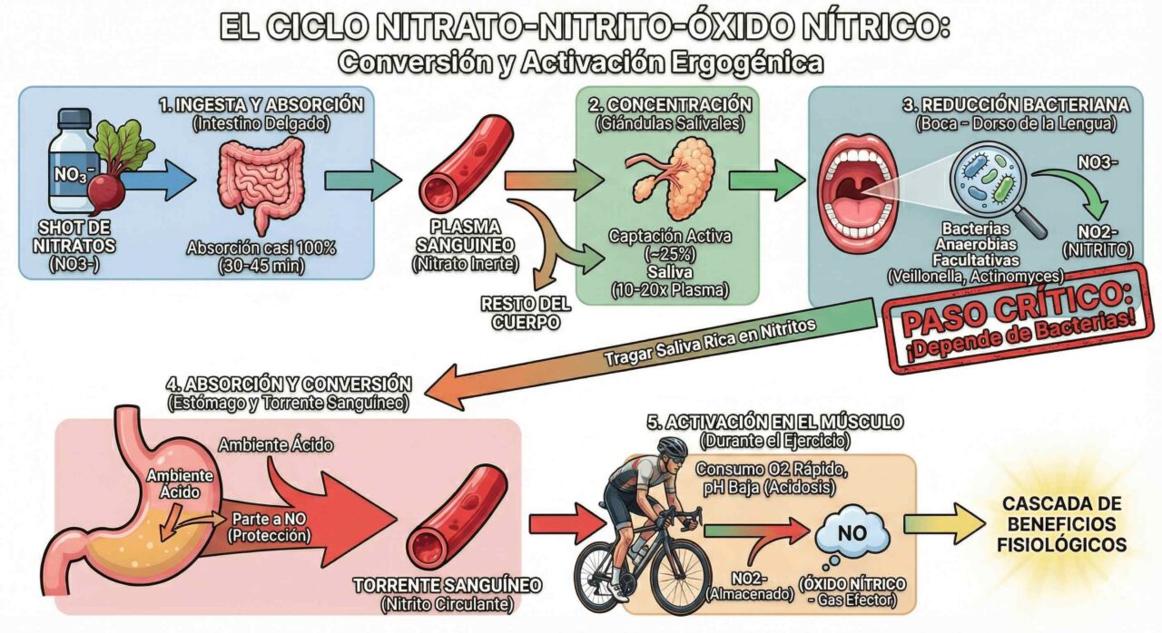 1. Ingesta y Absorción Rápida: Tras beber el shot, el nitrato inorgánico (NO3-) se absorbe casi al 100% en la parte proximal del intestino delgado y pasa al plasma sanguíneo en unos 30-45 minutos. En este punto, el nitrato es biológicamente inerte.